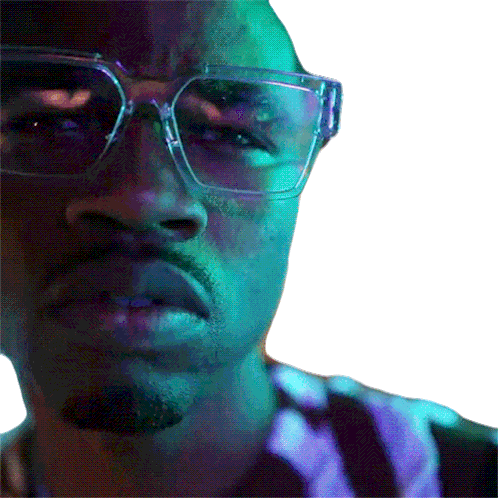 Roddy Rich with a confused expression, squinting his eyes while wearing clear glasses under purple lighting.