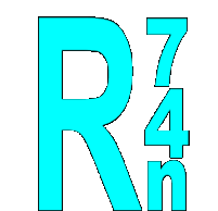 A cyan "R74n" logo squishes and distorts before returning to its original shape, creating a playful effect.