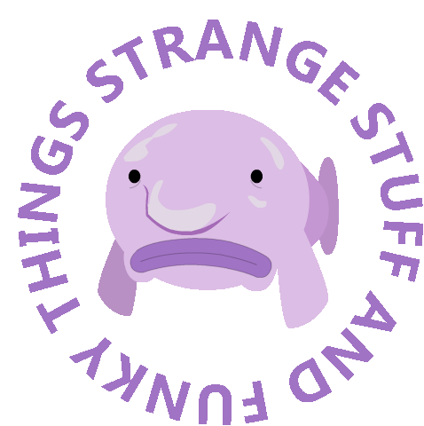 A purple blobfish, mascot for SSAFT, with a sad expression, surrounded by rotating text "Strange Stuff And Funky Things".