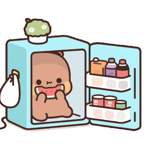 Sseeyall's Bubu Dudu bear character happily eats a slice of watermelon while sitting inside a light blue mini-fridge.