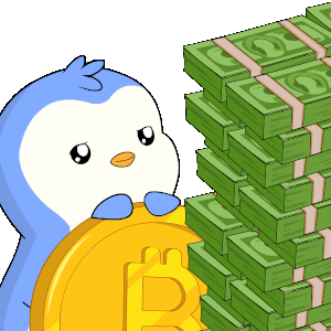 A cute Pudgy Penguin holds a Bitcoin coin next to towering stacks of cash, symbolizing wealth and crypto gains.
