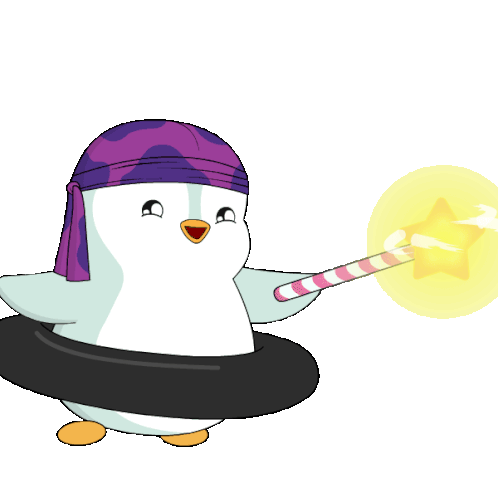 A cute penguin with a blue bow performs a magic trick, making a "poof" with its yellow staff.