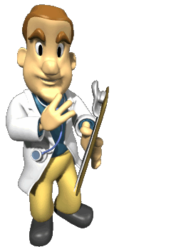 A friendly 3D animated doctor in a lab coat holds a clipboard displaying 'CHECK UP', ready for an appointment.