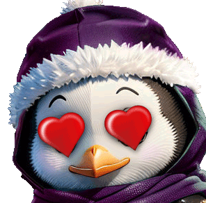 Star Citizen sticker: a cute penguin in a hat and scarf with heart eyes, symbolizing love for players like Sara and the Shadow Nation Rescue.