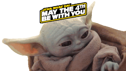 Grogu, also known as Baby Yoda, celebrates Star Wars Day with the iconic phrase 'May The 4th Be With You' displayed above him.