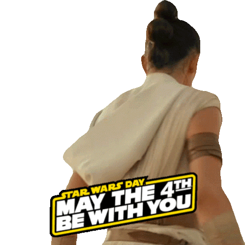 Rey from Star Wars celebrates Star Wars Day with a lightsaber and the iconic phrase 'May The 4th Be With You'.