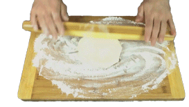 Hands expertly roll out dough on a wooden cutting board, dusted with flour, preparing for baking.