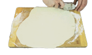 Hands carefully cut a large, flat piece of pizza dough on a floured wooden board, preparing it for baking.