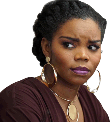 a woman wearing hoop earrings and a necklace looks at the camera