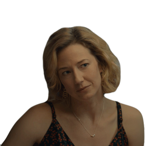 Carrie Coon as Callie Spengler from Ghostbusters Afterlife gives a subtle smirk and stare, head tilted.