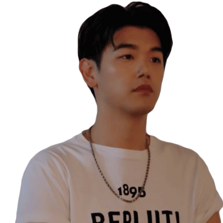 Eric Nam, the singer, looks curiously to the side with a thoughtful expression, wearing a white t-shirt with '1895 BERLUTI'.