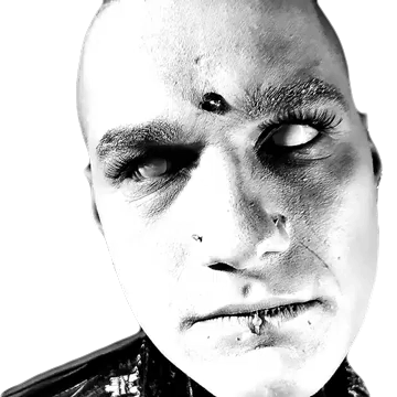 Mora Prokaza's striking black and white portrait, featuring an intense stare, white eyes, and a unique gothic aesthetic.