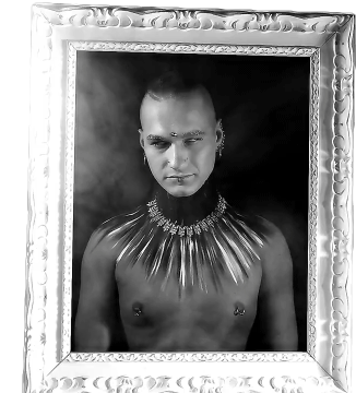 Mora Prokaza in a striking black and white portrait, featuring an intense stare and elaborate body art.