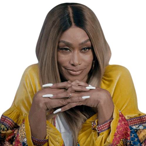 Tami Roman, portraying Chantel, stares intently with a subtle smirk, her hands clasped under her chin.