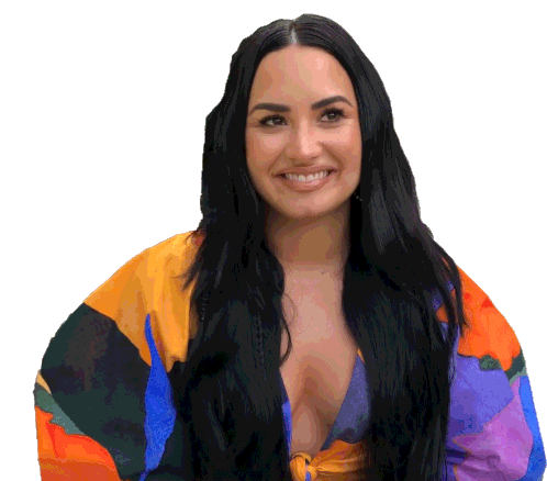 Demi Lovato smiles brightly, looking to the side, wearing a vibrant, multi-colored patterned top, exuding a cheerful and engaging mood.