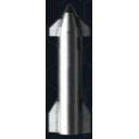 A sleek SpaceX Starship rocket rotates vertically against a dark, hexagonal patterned background.