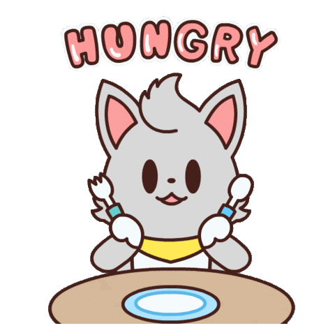 A cute grey cat character eagerly waits to eat, holding a fork and spoon, with 'HUNGRY' displayed above.