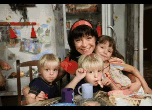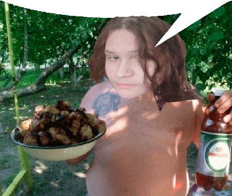 a shirtless woman holding a bowl of food and a bottle of coca cola