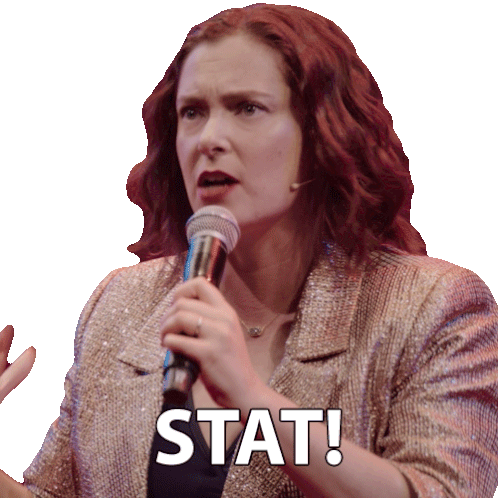 Rachel Bloom emphatically demands 'STAT!' while holding a microphone, conveying urgency and immediate action.