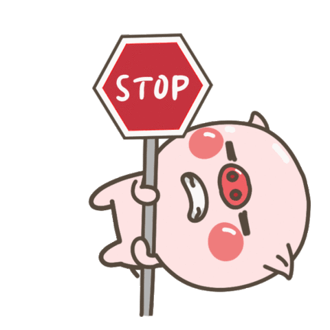 A cute pink cartoon pig holds a red stop sign with 'STOP' written on it, conveying a 'hold on' or 'wait' message.