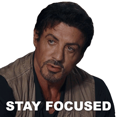 Barney Ross, portrayed by Sylvester Stallone, looks intently and says 'Stay Focused' in this motivational sticker.