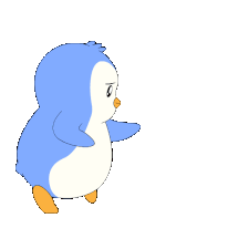 A cute blue and white cartoon penguin walks stealthily, then stops and looks around nervously with a worried expression.
