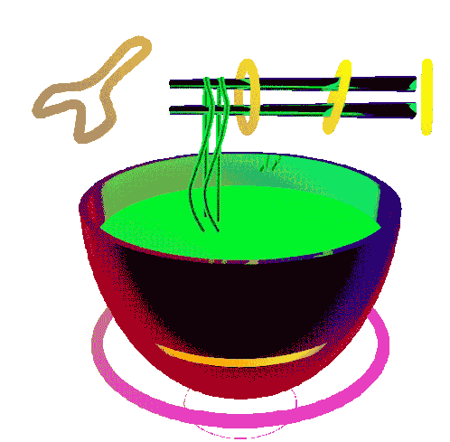 An animated sticker featuring a stylized bowl of vibrant green ramen noodles with chopsticks, surrounded by colorful abstract shapes.