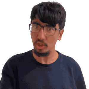 a man with glasses and a beard is pointing