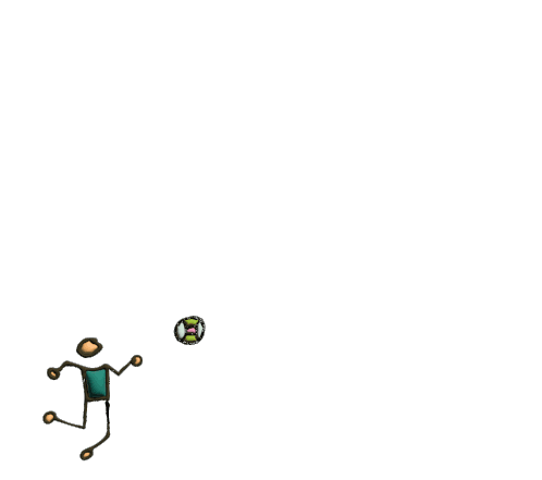 An animated stick figure with a gooey texture plays with a colorful ball, heading it in a playful motion.