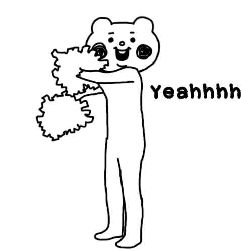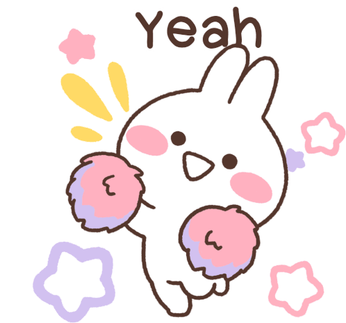 Mimi, a cute rabbit character, enthusiastically cheers with pink and purple pom-poms, exclaiming "Yeah" and "Go!".