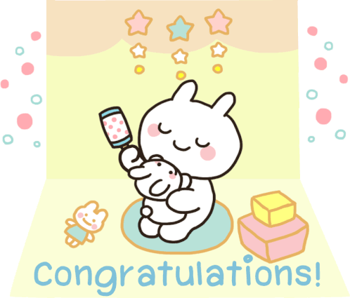 Mimi and Neko rabbit characters celebrate a new baby with gifts and congratulations on a pop-up card.
