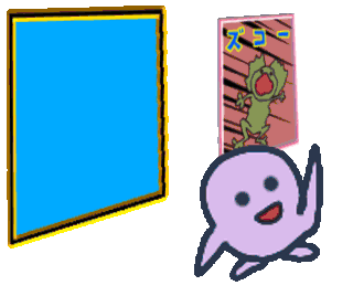 Animated characters like a purple blob, green snake, and blue blob pop out from behind frames, then appear on the frames with Japanese text.