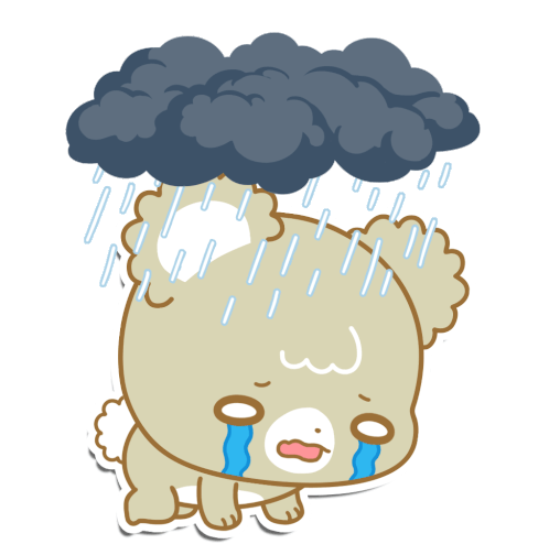 Mocha from Sugar Cubs sits sadly under a dark rain cloud, crying tears. A gloomy and emotional animated sticker.