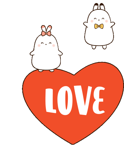 Two cute cartoon bunnies, one with a pink bow and one with a yellow bow tie, happily hop and jump around a red heart with 'LOVE' written on it.