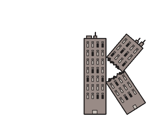 An animated sticker featuring two grey buildings, one standing tall and the other broken and tilted to form the letter 'K'.