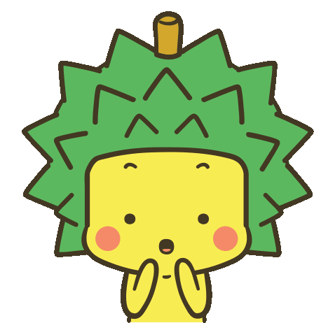 A cute cartoon durian character with a green spiky head and yellow body looks utterly surprised or shocked, with its mouth wide open.
