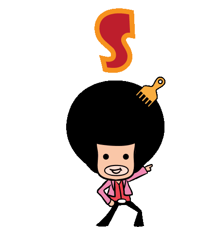 A fun character with a large afro spells out 'STOP' with dynamic gestures and animated text, conveying a clear message to cease.