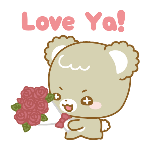 Mocha bear from Sugar Cubs holds a beautiful bouquet of red roses, shyly saying 'Love Ya!' to express affection.
