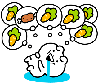 Usagyuuun is crying from hunger, dreaming of carrots and wondering "What should I eat?" (お腹空いた).