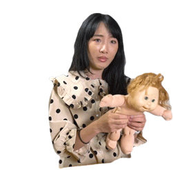 Softpomz holds a Cabbage Patch Kid doll, looking surprised or confused at the viewer.