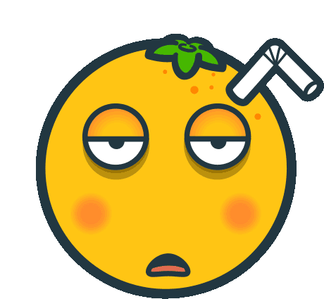 An orange emoji character, Kamoji Oren, looks utterly exhausted and bored with a straw in its head, conveying extreme fatigue.