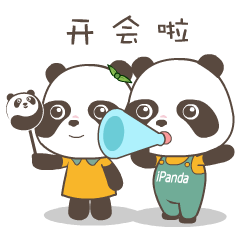 Two cute iPanda cartoon pandas, one with a megaphone, calling everyone to a meeting. Features Chinese text '开会啦'.