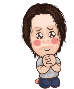 A cartoon caricature of a person kneeling with hands clasped, displaying a pleading expression with large, sparkly eyes and rosy cheeks.