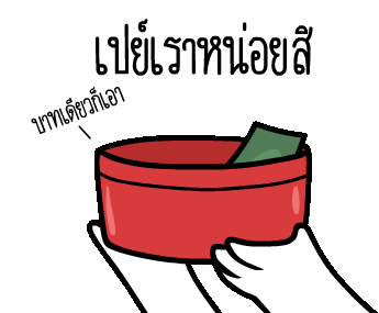 A cartoon hand holds a red bowl asking for money, with text "Pay us a little, please, even one baht is fine."