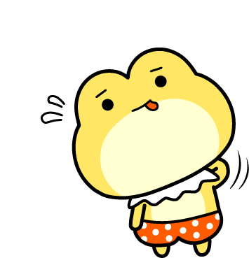A cute yellow cartoon frog in polka-dot shorts looks awkward and nervous, scratching its head with sweat lines.