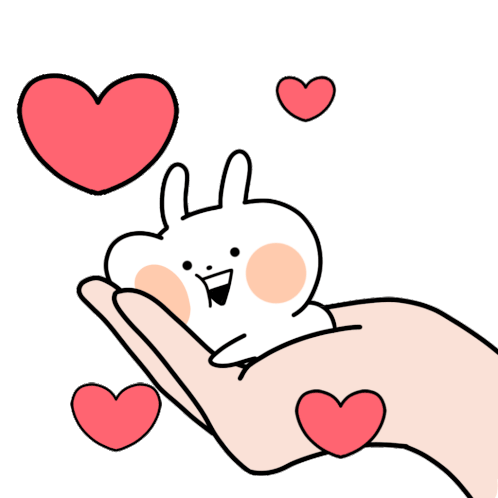 A cute white rabbit character, Usagyuuun, held gently in a hand, expressing happiness with floating hearts.