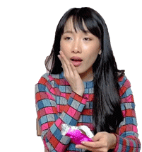softpomz reacts with a surprised and slightly disgusted expression, holding foil, in a colorful plaid shirt.
