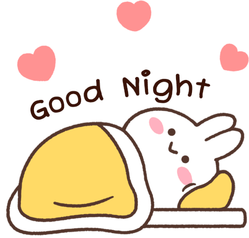 Adorable Mimi the rabbit is sleeping soundly under a yellow blanket with floating hearts, conveying a sweet "Good Night" message.