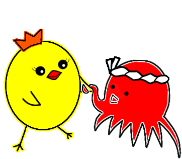 Piyomi the chick and a red octopus hold hands, smiling happily as hearts float around them, showing their friendship and love.