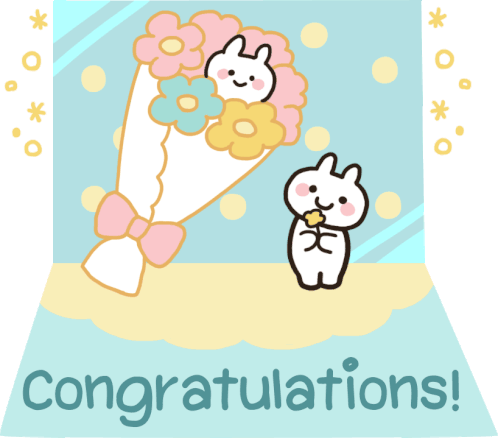 Mimi and Neko celebrate with a bouquet of flowers, expressing congratulations and joy. A cute animated sticker.